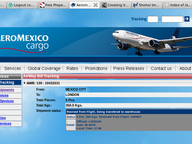 | Aeromexico cargo MEX to LHR, $USD 1140 at 1.46 USD to GBP | £780.82 |